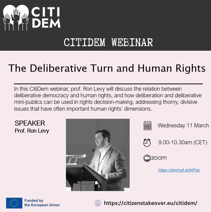 In this CitiDem webinar, Ron Levy discusses deliberation in relation to human rights and human rights adjudication. Prof. Ron Levy is professor of law at the Australia National University, and he is an interdisciplinary researcher writing on public law and political theory – especially deliberative democratic theory.