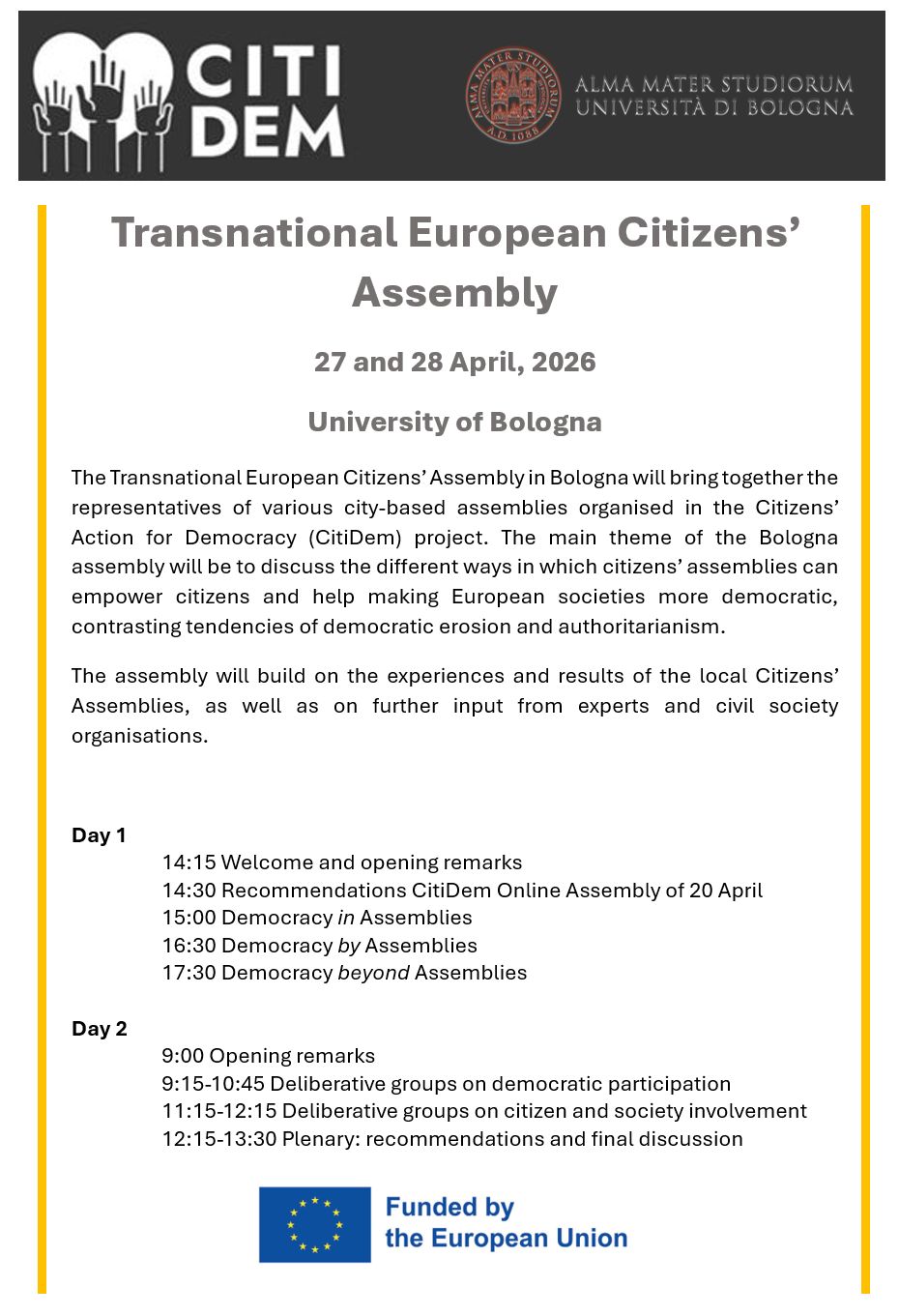 27 – 28 April, 2026: Transnational European Citizens’ Assembly in Bologna