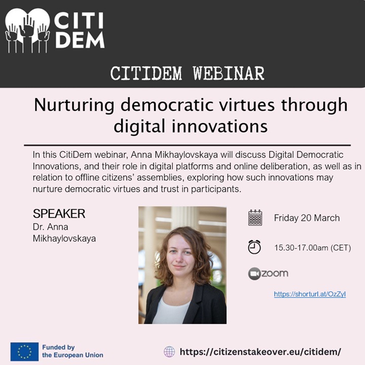In this CitiDem webinar, Anna Mikhaylovskaya discusses Digital Democratic Innovations, and their role in digital platforms and online deliberation, as well as in relation to offline citizens’ assemblies, exploring how such innovations may nurture democratic virtues and trust in participants.