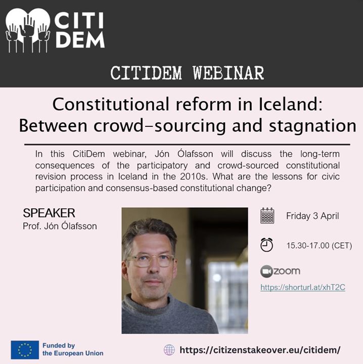 In this CitiDem webinar, Jón Ólafsson will discuss the long-term consequences of the participatory and crowd-sourced constitutional revision process in Iceland in the 2010s. What are the lessons for civic participation and consensus-based constitutional change?